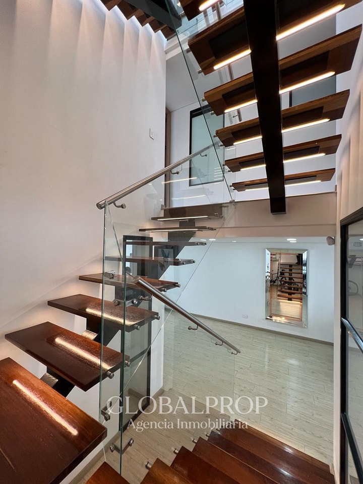 - Escaleras con una de las mejores maderas como lo es flor morado, junto con un diseño fabuloso de iluminación en su parte inferior y vidrio templado en sus laterales.